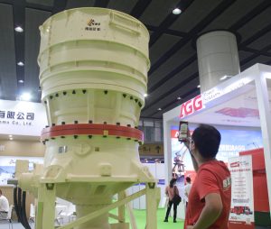 作為一年一度的國際性砂石盛會,此次展會集中展示了業(yè)內(nèi)最前沿、最先進的新產(chǎn)品、新技術(shù)、新工藝。南昌礦機本次參展的設(shè)備是一臺CC500S大型單缸液壓圓錐破碎機,該設(shè)備可廣泛適用于金屬礦山和骨料生產(chǎn)線二段破碎,最大產(chǎn)量可達1250噸/小時,排料口可在32-83mm范圍內(nèi)調(diào)整,最大給料粒度達560mm,具有產(chǎn)量大、破碎比高的特點。